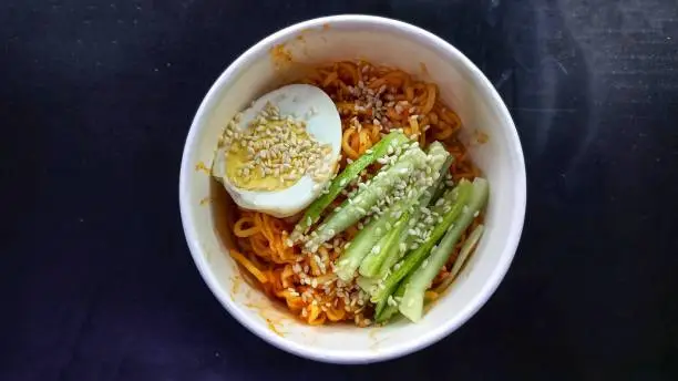 - 조리법: 전자레인지용 카레를 비빔면에 얹어 섞기