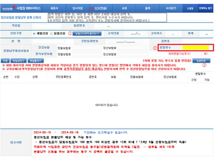 - 2024년도 귀속 근로자 연말정산 결과, 정산 보험료가 해당 월 보험료 이상으로 발생한 경우에만 분할납부 신청이 가능합니다.